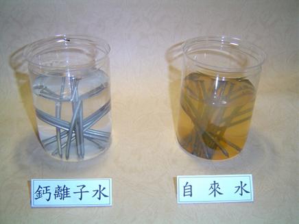 水是 H + H + O = H2O,但添加「离子钙粉」之水后,这瓶水就会变成 H2O + Ca + Ma + Na…。此时众多溶碱加水会破坏一个H当触媒中和酸素→但H+O会被留下来(抗氧化 = 抗酸化 = 抗老化);碱性水因氧比氢多,故能延缓铁钉酸化锈蚀之时间(本实验只需四小时即见铁锈溢出)。 |